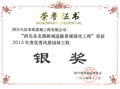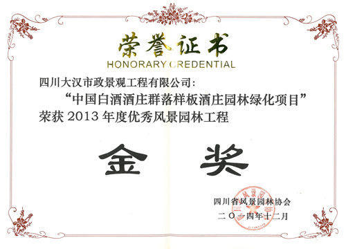 熱烈慶我司在“中國白酒酒莊群落樣板酒莊園林項(xiàng)目”榮獲2013年優(yōu)秀風(fēng)景園林工程金獎;“西充縣北部新城道路景觀工程”榮獲2013年度優(yōu)秀風(fēng)景園林工程銀獎。