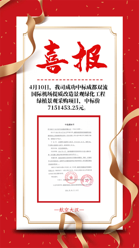 熱烈祝賀我司中標(biāo)成都雙流國際機(jī)場提質(zhì)改造景觀綠化工程綠植景觀采購項(xiàng)目
